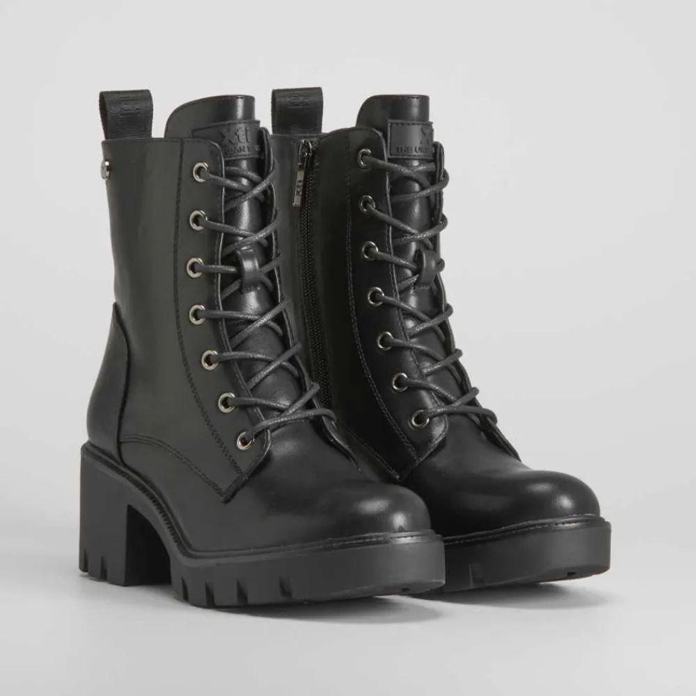 Botín de tacón ancho con suela dentada de la marca XTI. Modelo con cordones encerados, ojales metalizados y cierre de cremallera lateral.