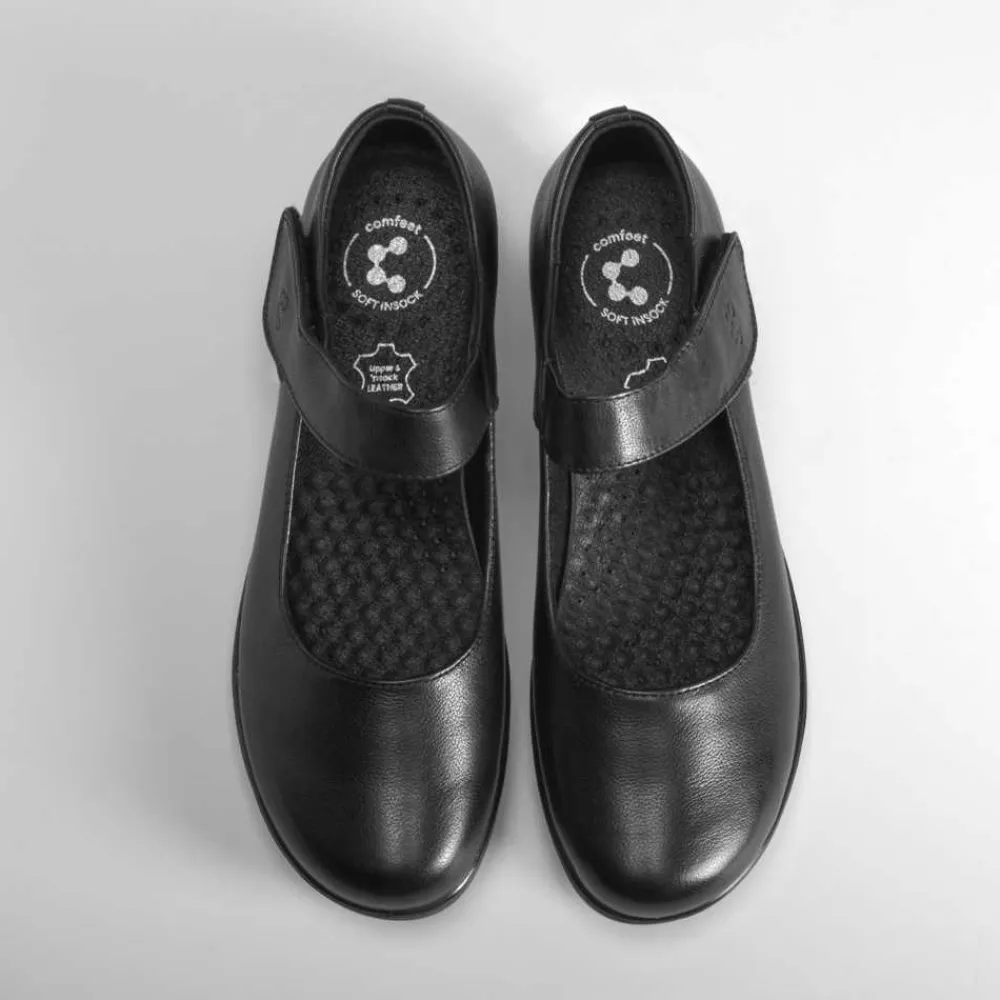 Mercedita de color negro de la marca COMFEET para mujer. El corte es de piel con un acabado sobrio y fácil de combinar. Tiene una tira de velcro ajustable y una cuña de 4cm de altura.