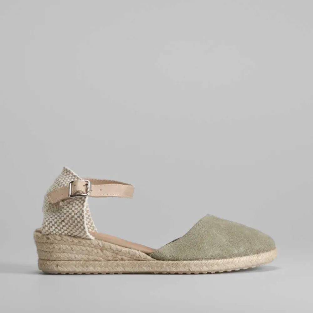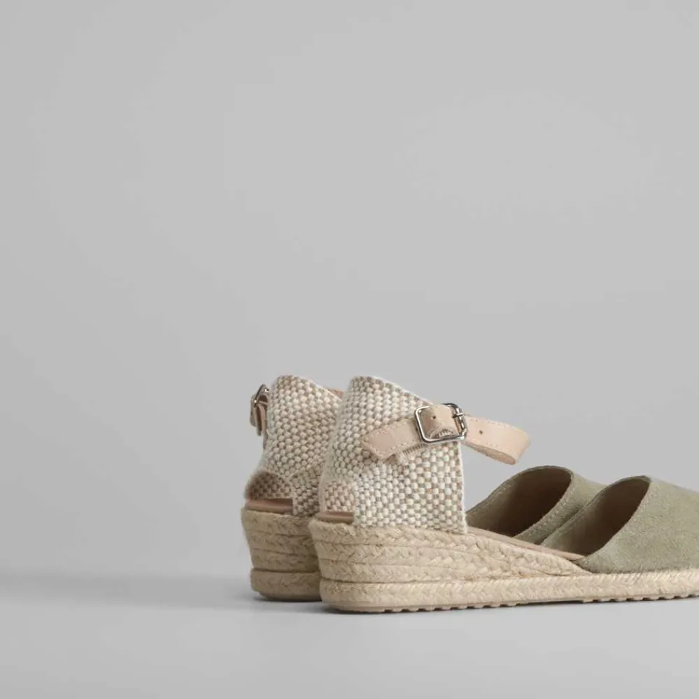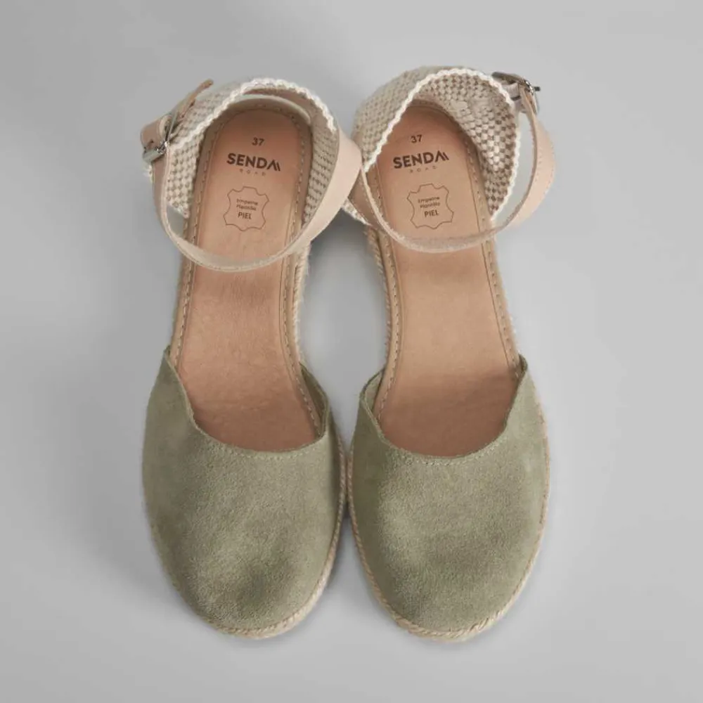 Sandalia de piel para mujer de la marca SENDA ROAD. Modelo en color verde, cierre de hebilla trasero ajustable y suela de yute con cuña de 4cm. Hecho en España.