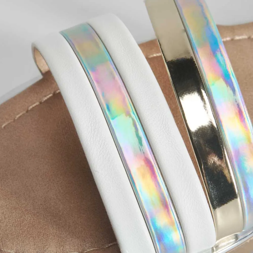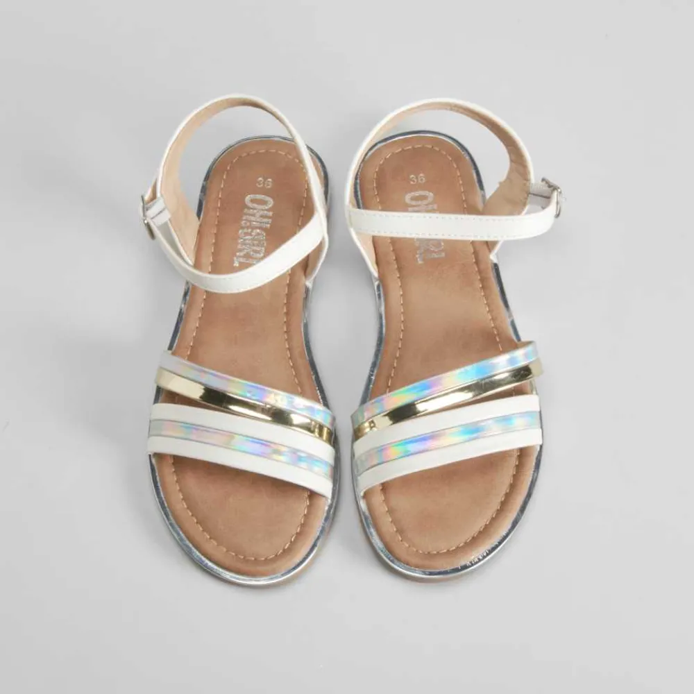 Sandalia blanca infantil de la marca OH GIRL. Pala combinada con tiras metalizadas e iridiscentes. Cierre de hebilla.