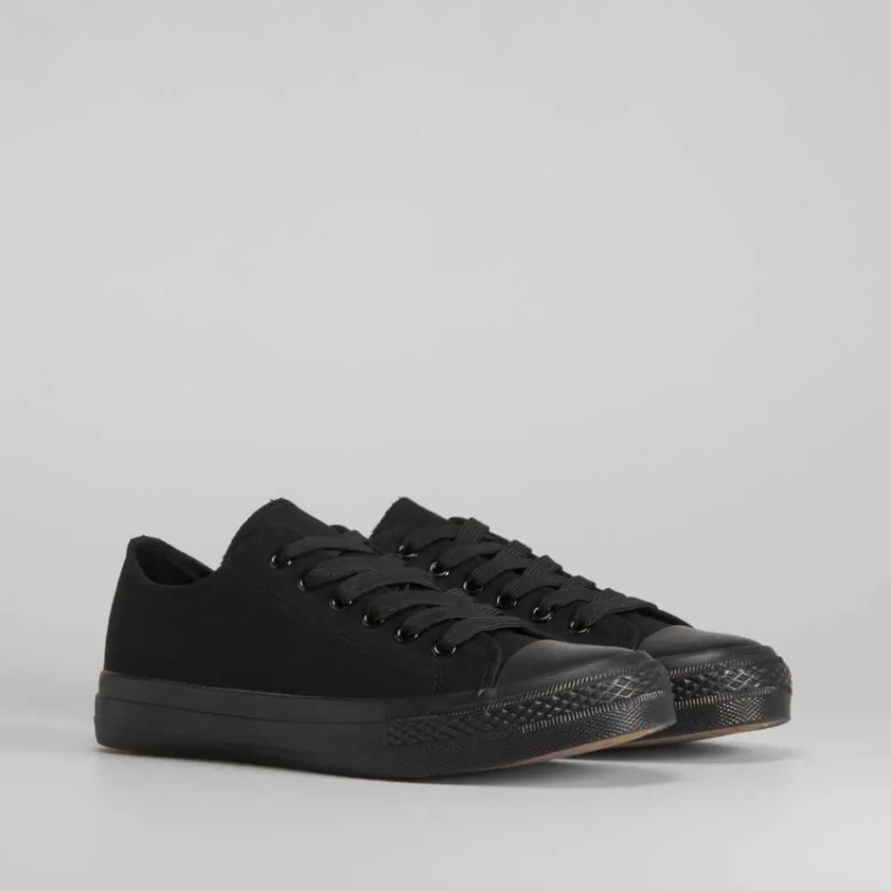 Zapatilla de lona básica de la marca NYC para hombres. Exterior liso en color negro. Cierre de cordones y puntera de caucho.