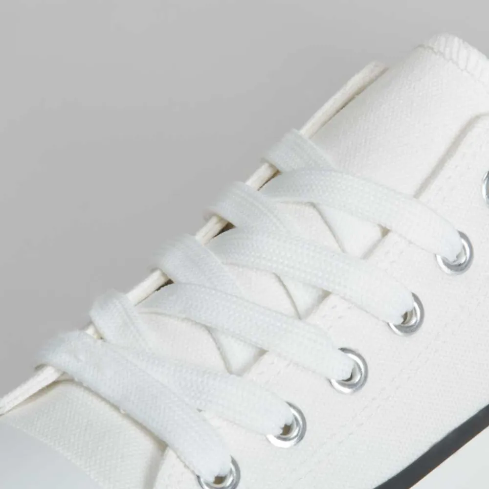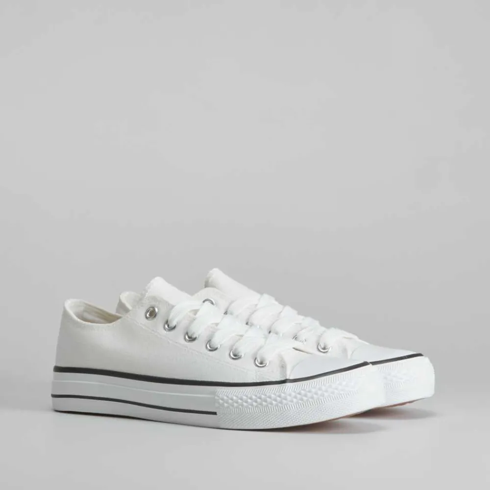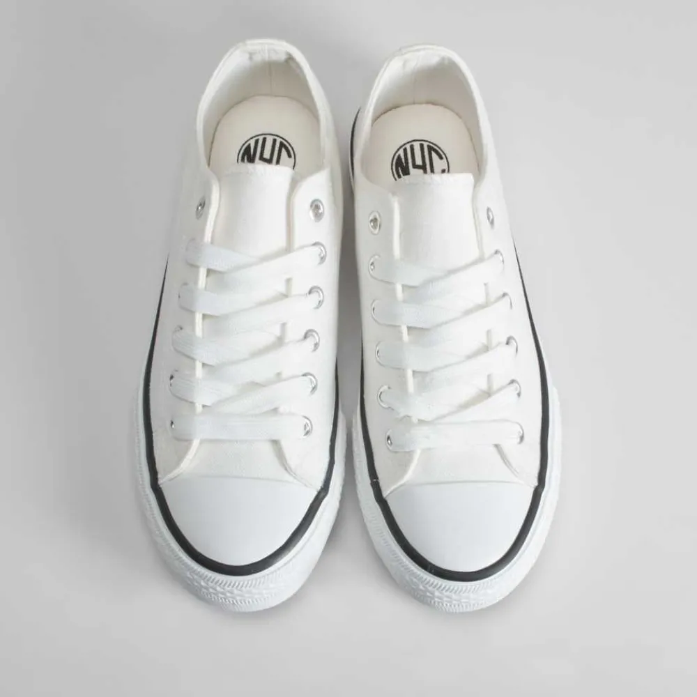 Zapatilla de lona básica de la marca NYC para mujer. Exterior textil liso y sencillo en color blanco. Cierre de cordones y puntera de caucho.