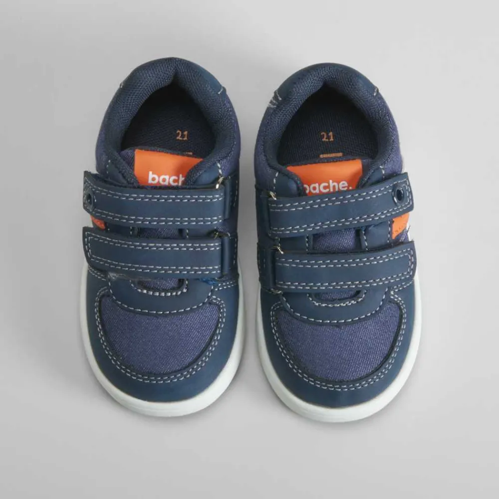 Zapatilla deportiva con velcros de BACHE para bebé. Modelo en color azul efecto denim con dos tiras de velcro y banda lateral.