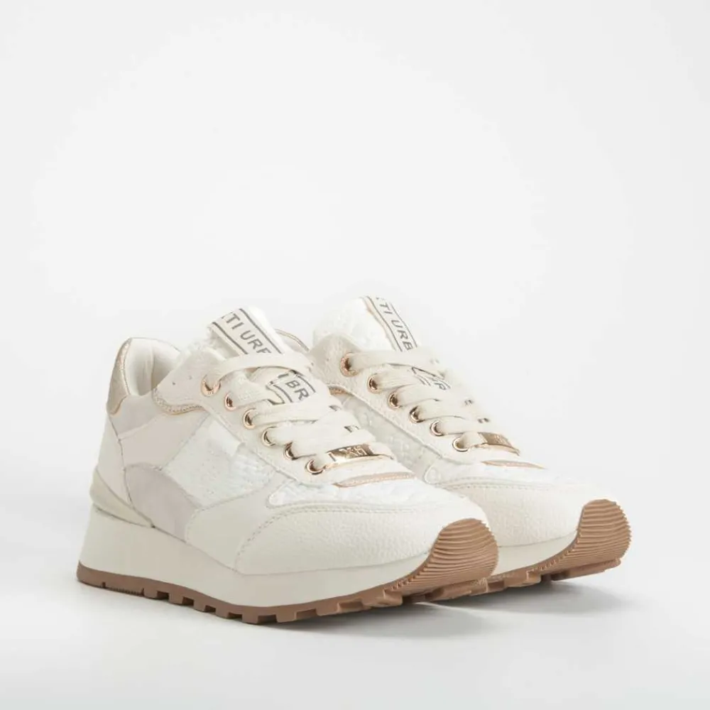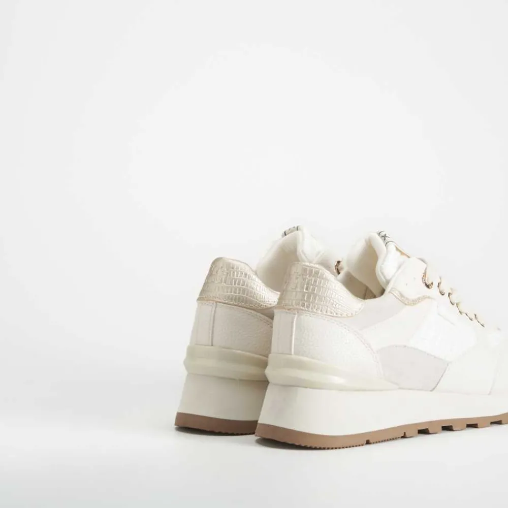 Zapatilla urbana para mujer de la marca NYC. Modelo con paneles combinados en color beige y gris, cierre de cordones y suela dentada bicolor.