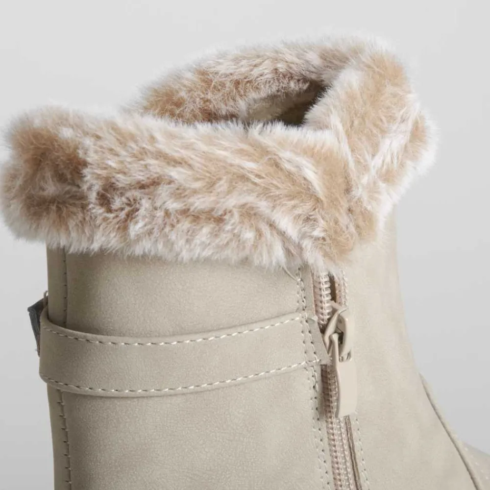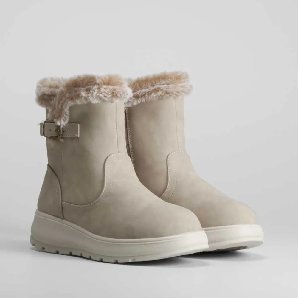 Botín apreski plataforma COMFEET. Este botín en color taupe, fabricado en material sintético cuenta con la tecnología 3D Therapy, que incorpora microburbujas que estimulan la circulación y alivian la fatiga con cada pisada. Las microburbujas favorecen la circulación sanguínea, proporcionando una sensación de masaje que reduce la sensación de cansancio. La plataforma ofrece estabilidad y confort para el uso diario, proporcionando un estilo moderno y funcional.