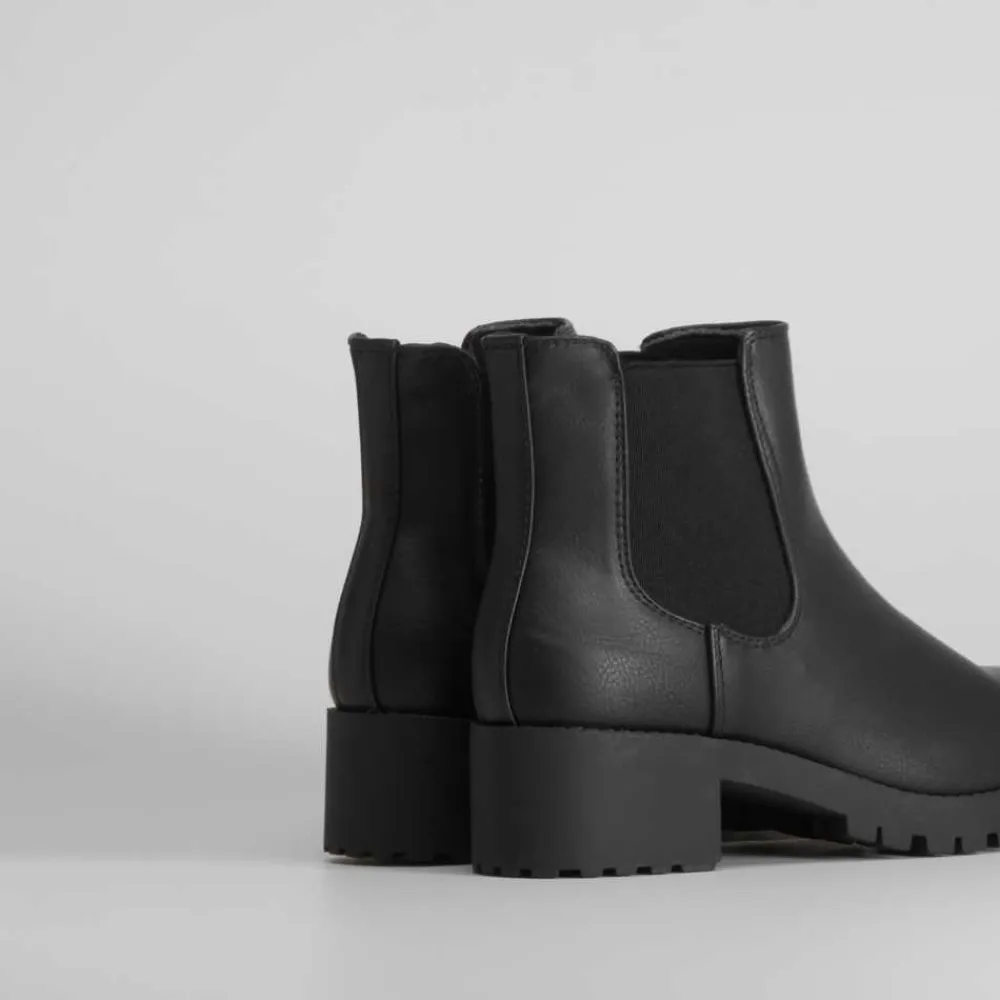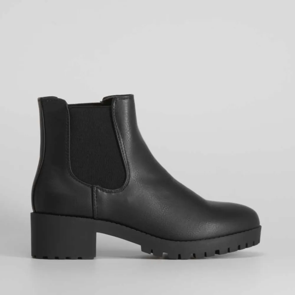 Botín chelsea básico con tacón track de la marca NYC para mujer. Exterior en color negro con dos elásticos laterales para un calce sencillo y un look a la última. Tacón dentado de 5cm de altura.