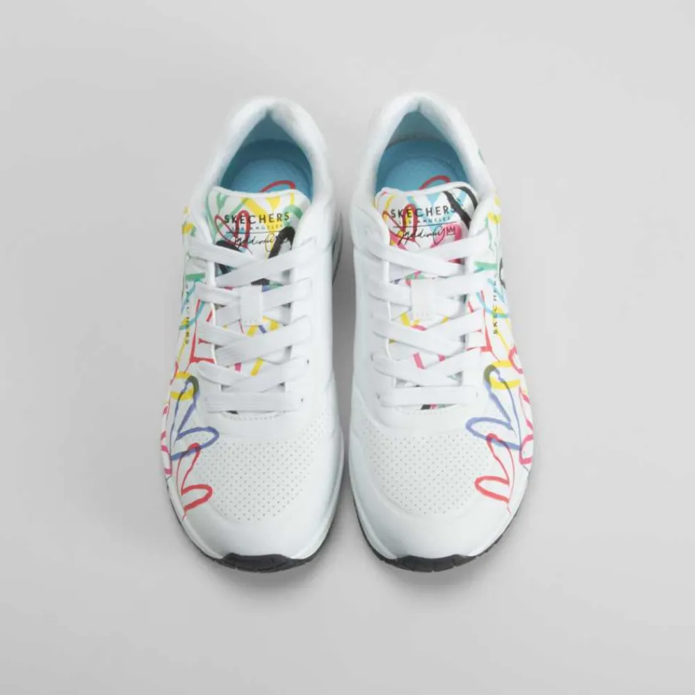 Destaca con las zapatillas UNO JGOLDCROWN de SKECHERS, una explosión de creatividad y estilo urbano. Con un diseño en textil blanco adornado con corazones multicolor, estas zapatillas son perfectas para quienes buscan expresar su personalidad con cada paso.