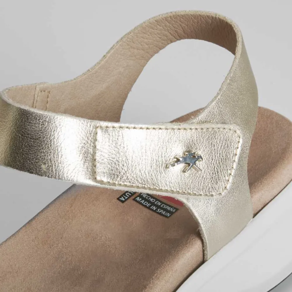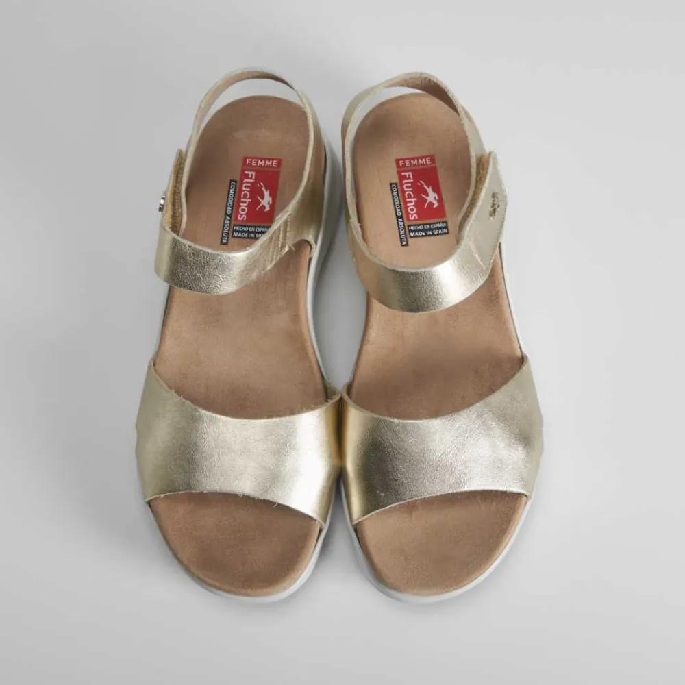 Sandalia con cuña confeccionada en piel de la marca FLUCHOS. Corte metalizado con pulsera de velcro. Suela flexible y confortable con una altura de 5cm. Hecho en España.