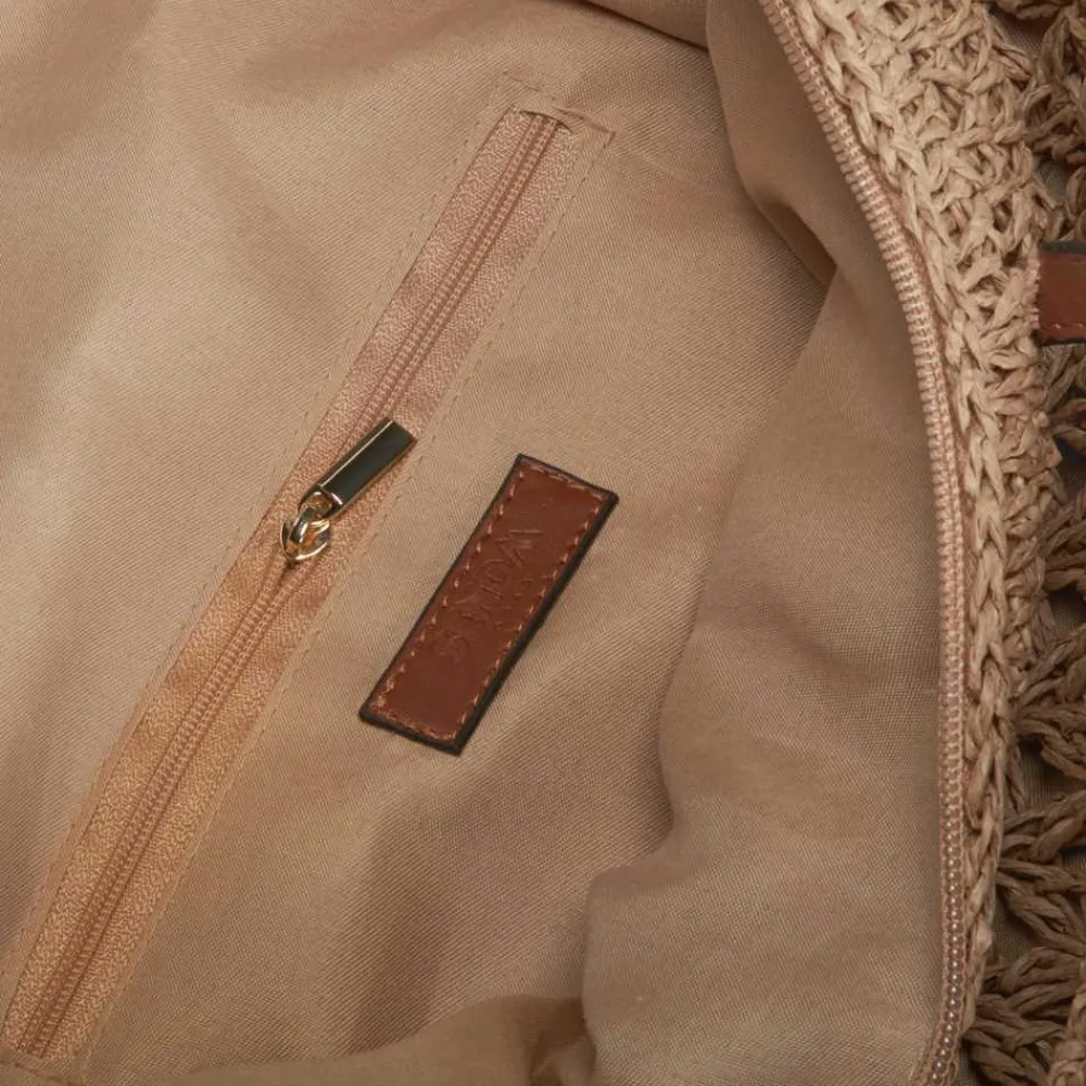 Bandolera de rafia rectangular de la marca SENDA ROAD. Compartimento con cremallera y bolsillo interior.