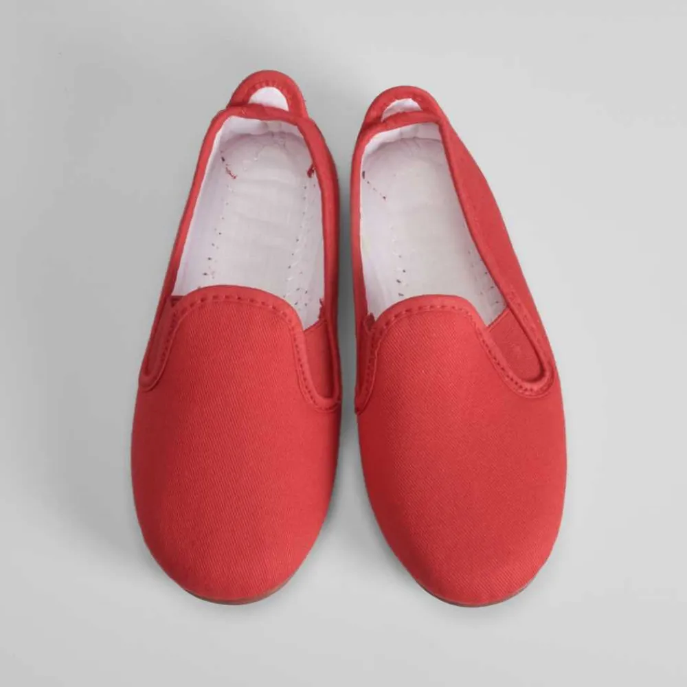 Zapatilla kunfu de la marca SEVEN FIVE. Modelo en color rojo con dos elásticos y suela ligera de goma. Hecho en España.