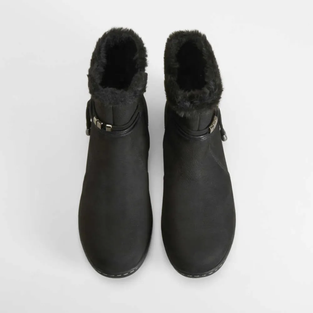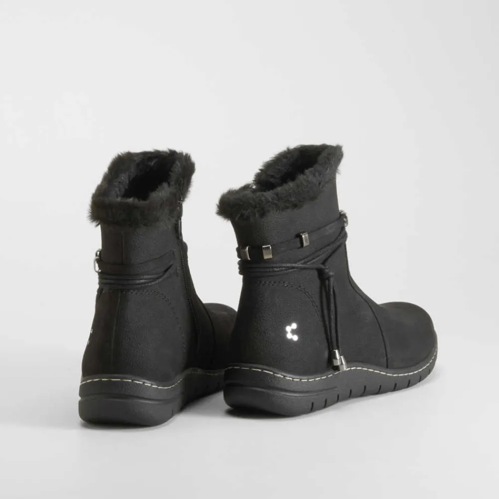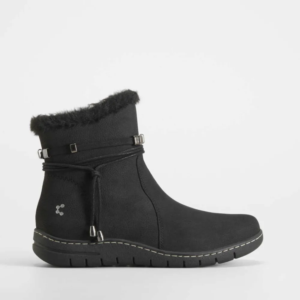 Este botín negro presenta una caña media y detalles de cordón decorativo con pequeños adornos metálicos, ideal para combinar con estilos urbanos y casuales. El diseño incluye una suela de goma que aporta comodidad y seguridad al caminar. La marca COMFEET garantiza calidad y confort en cada paso.
