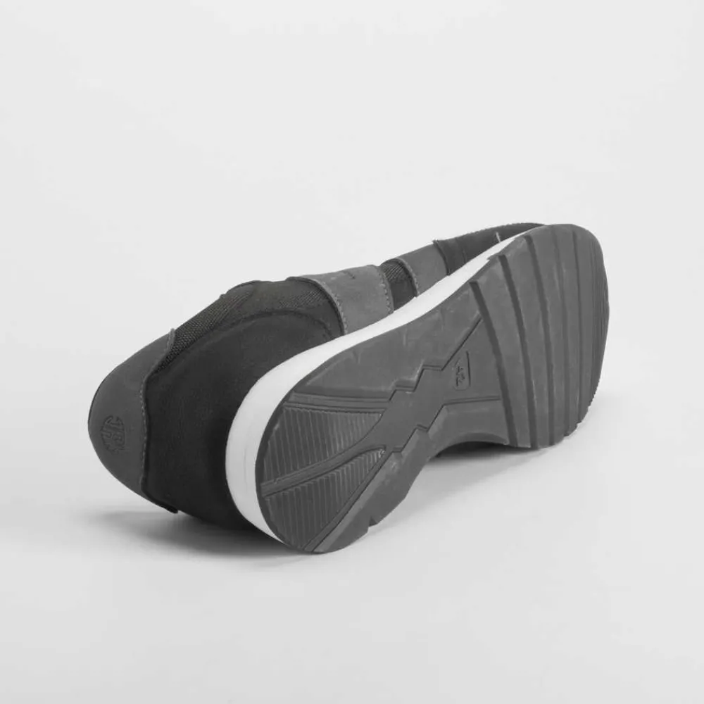 Zapatilla de color negro con detalles en gris y suela blanca que aporta contraste y estilo casual. El diseño incorpora franjas laterales y ojales decorativos rojos para un toque moderno y versátil. Ideal para el día a día, este modelo pertenece a la marca NYC.