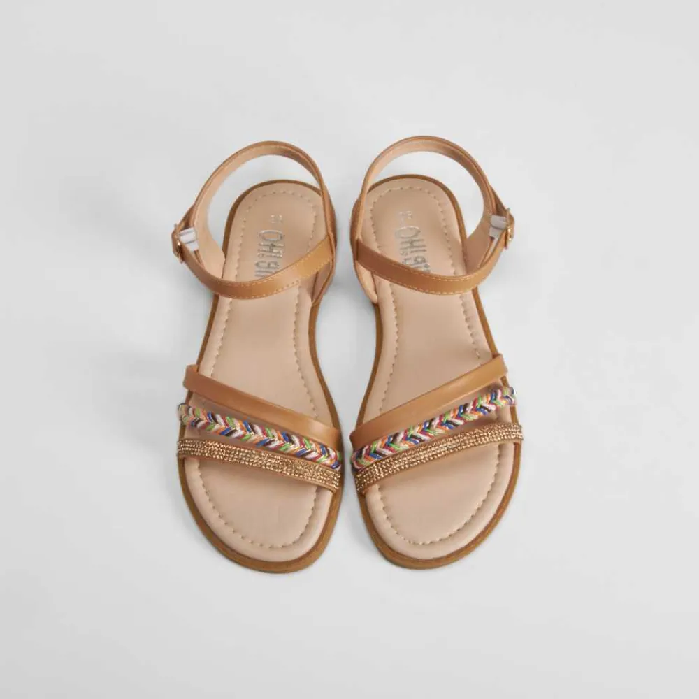 Sandalia plana infantil en color rosa de la marca OH GIRL. Pala adornada con tiras combinadas en diferentes materiales y acabados. Cierre de hebilla.