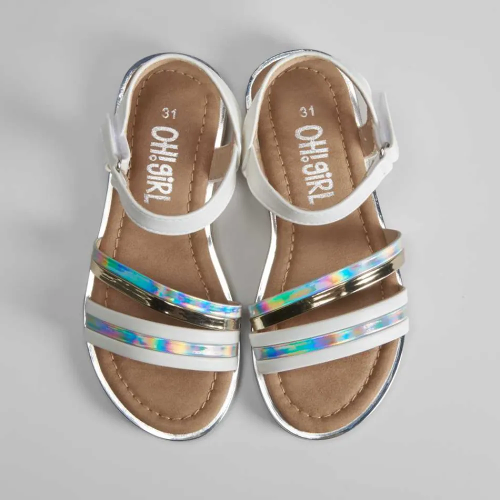 Sandalia blanca infantil de la marca OH GIRL. Pala combinada con tiras metalizadas e iridiscentes. Cierre de velcro.