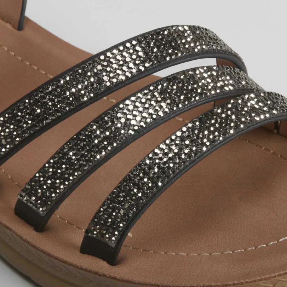 Sandalia con cuña de la marca SENDA ROAD para mujer. Corte en color negro con tres tiras finas en la pala adornadas con brillos y pulsera con cierre de hebilla.