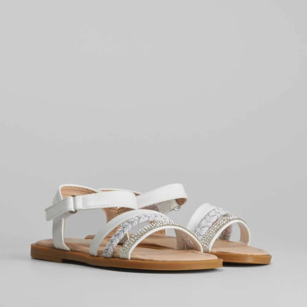 Sandalia plana infantil en color blanco de la marca OH GIRL. Pala adornada con tiras combinadas en diferentes materiales y acabados. Cierre de velcro.