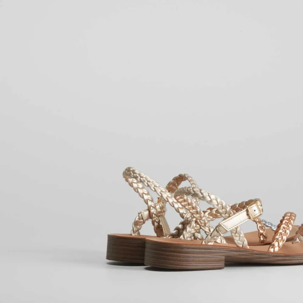 Sandalia plana y trenzada de la marca NYC. Modelo metalizado con cierre de hebilla.