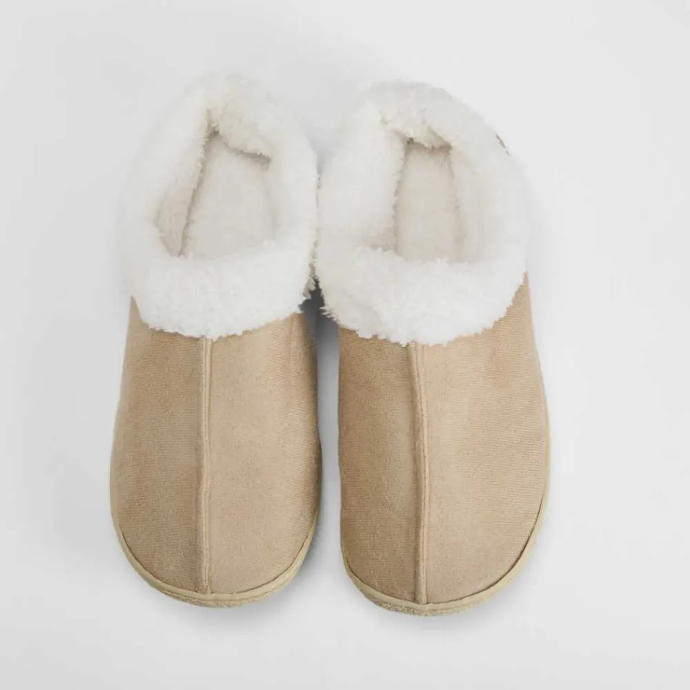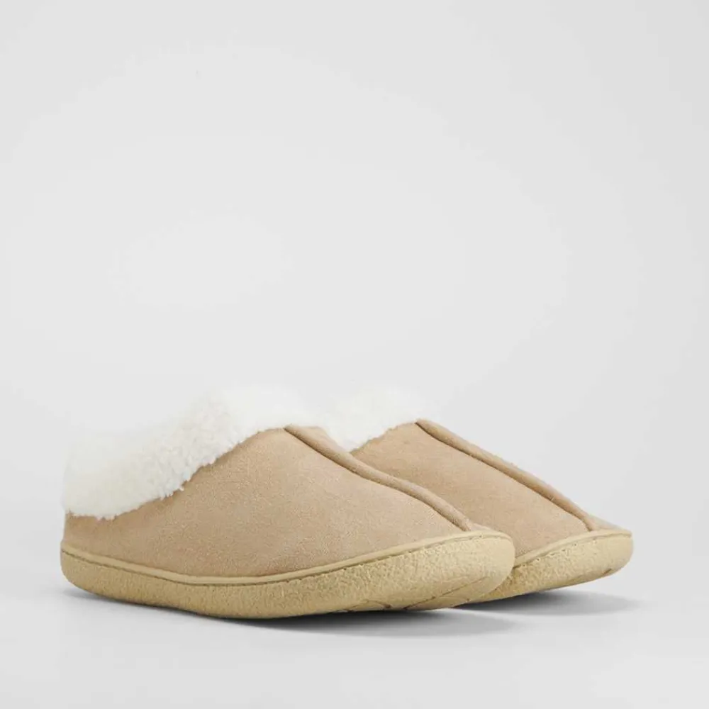 Zapatilla casa para hombre de ACHUCHONAS. Modelo en color beige con una banda de pelo y planta de gel muy confortable.